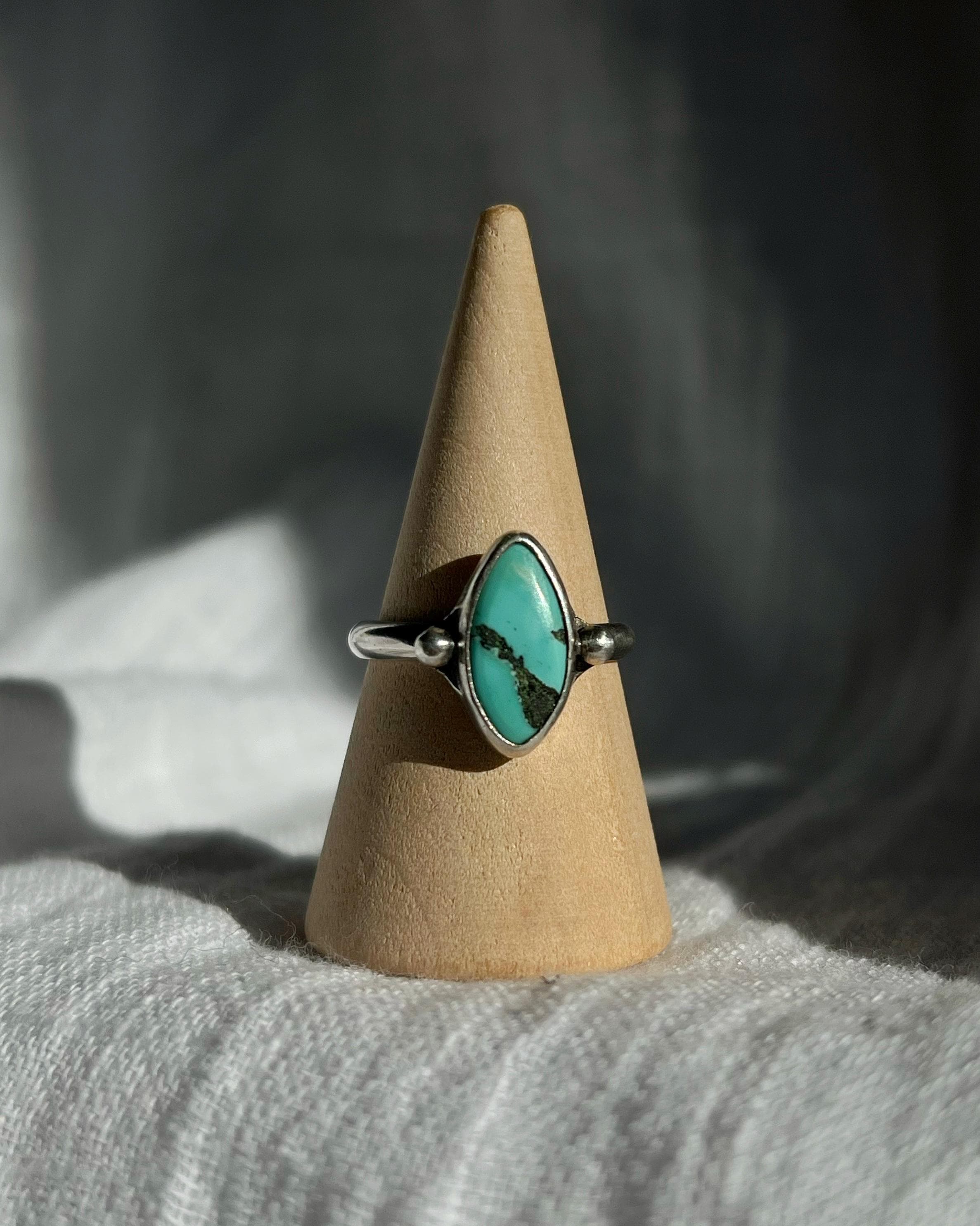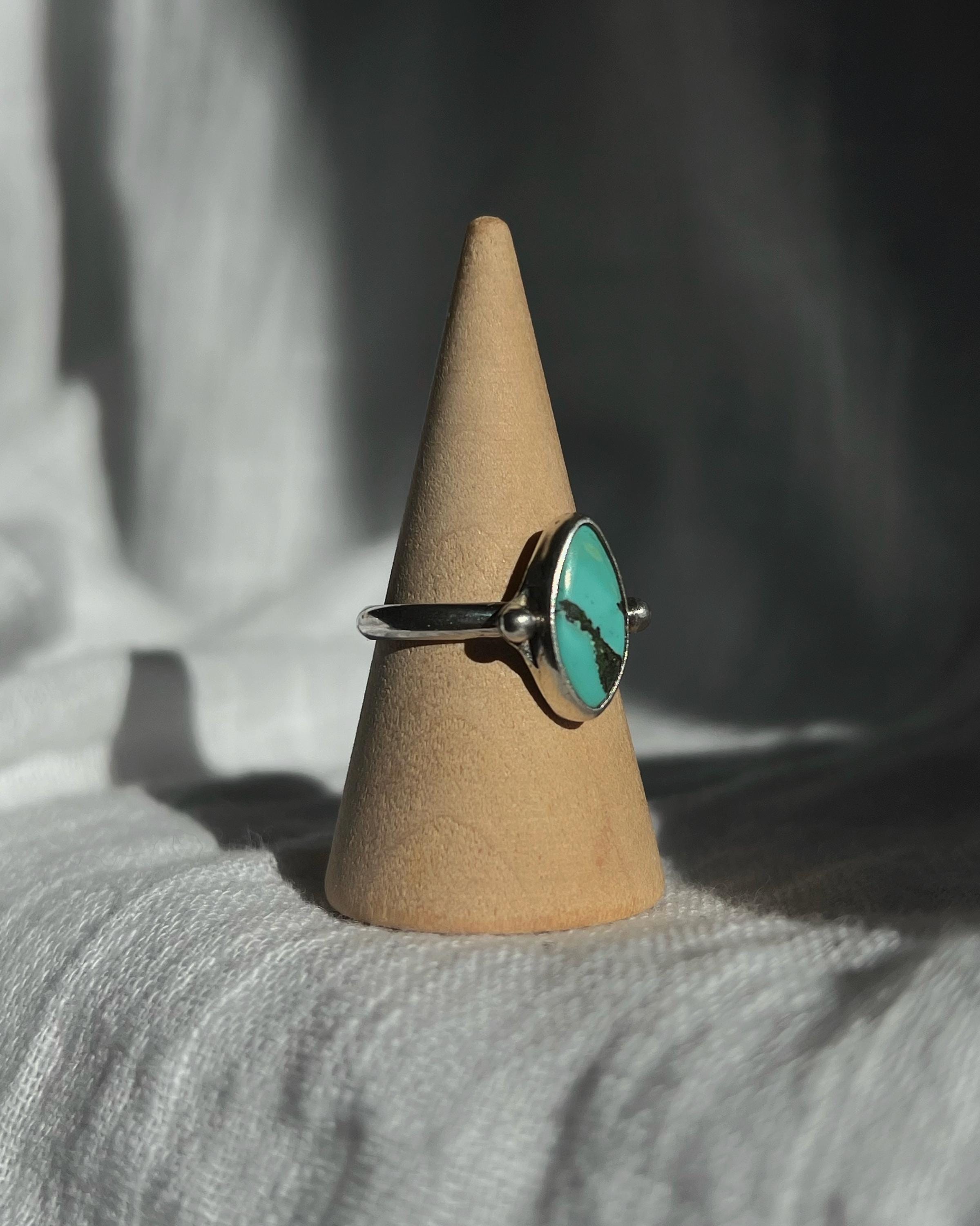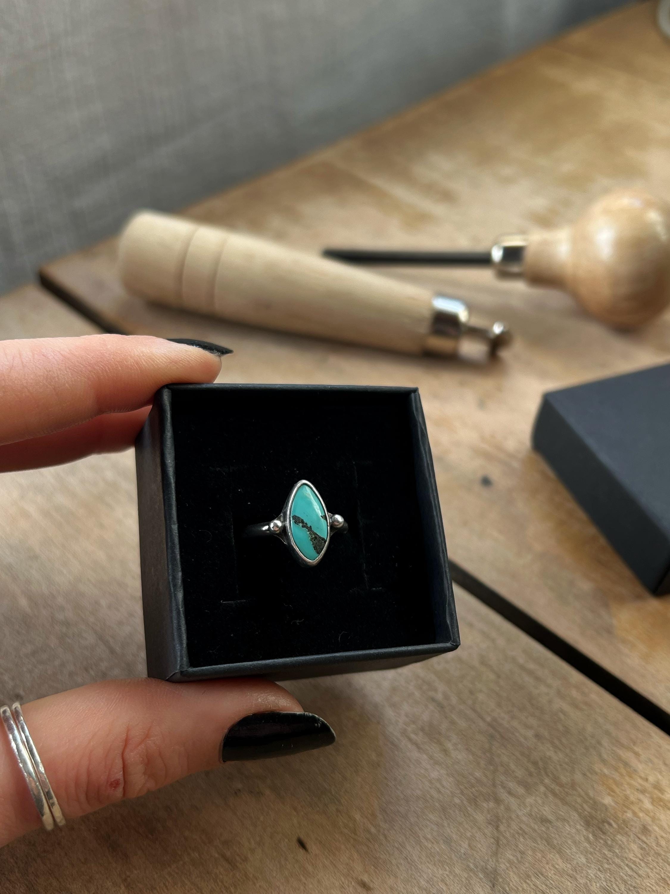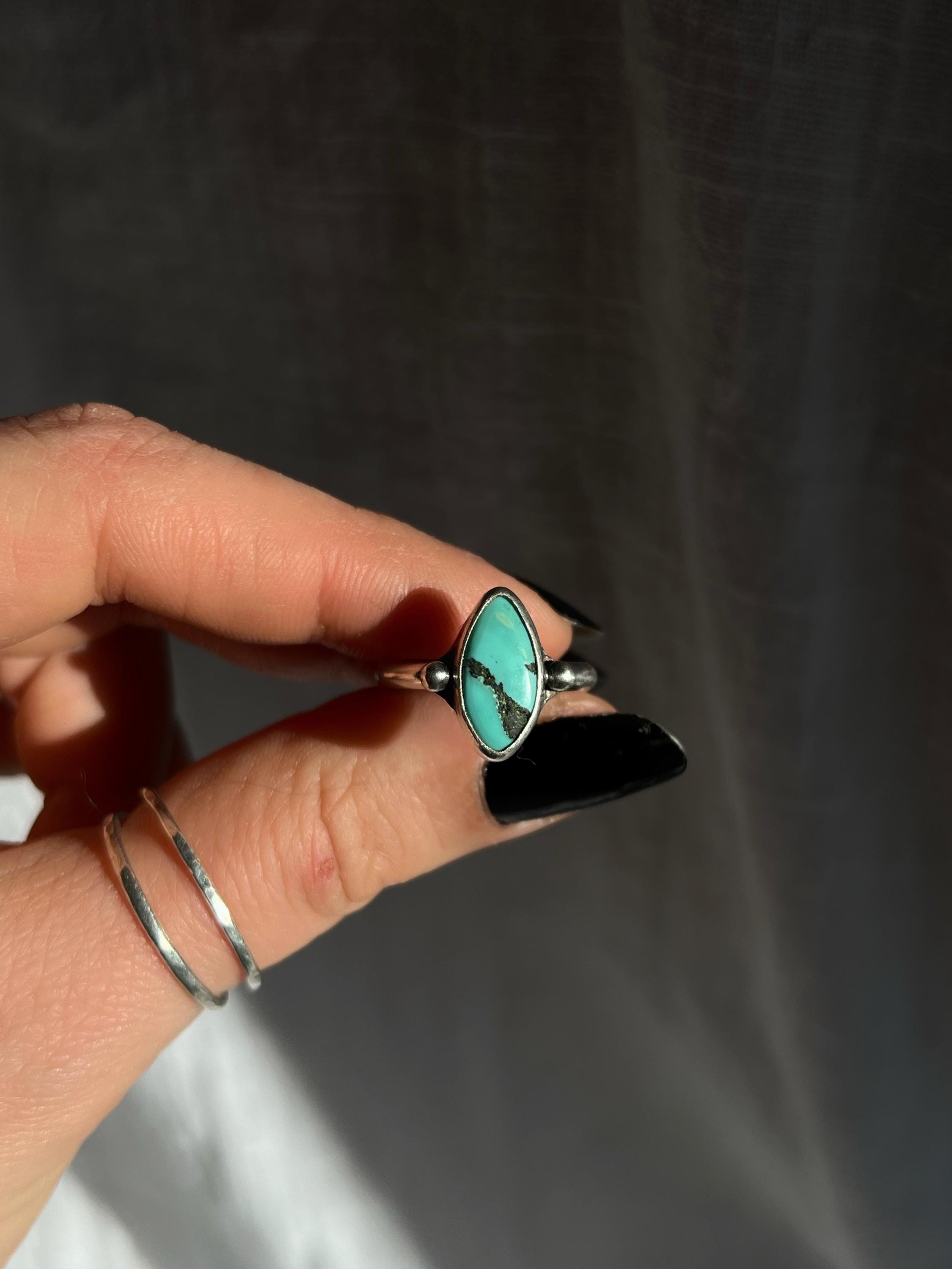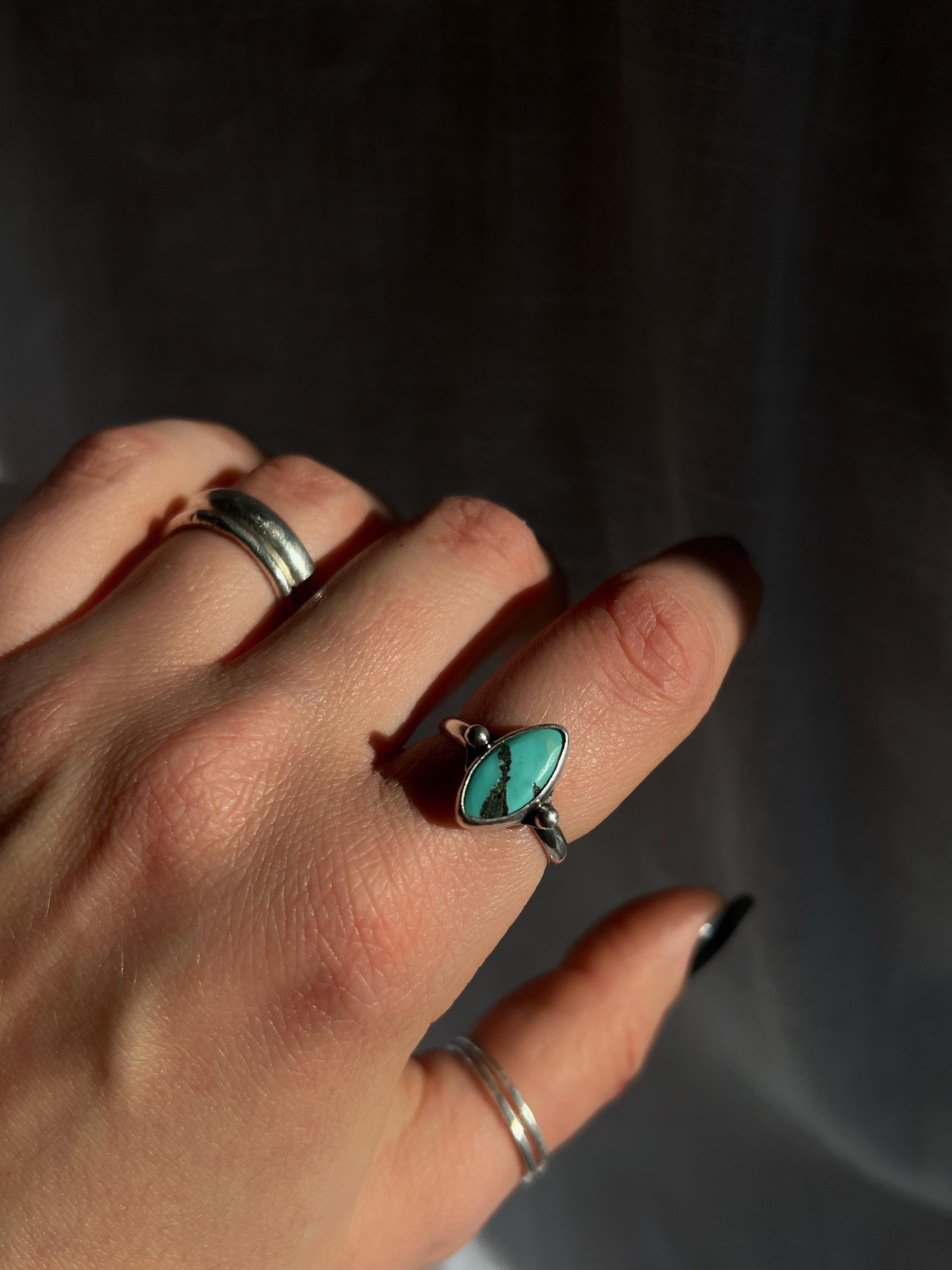 Handcrafted entirely by hand, this 925 sterling silver ring features an authentic turquoise with a vibrant hue and irregular shape, emphasizing its natural authenticity. Each stone is unique, with shades and veins that tell its own story.