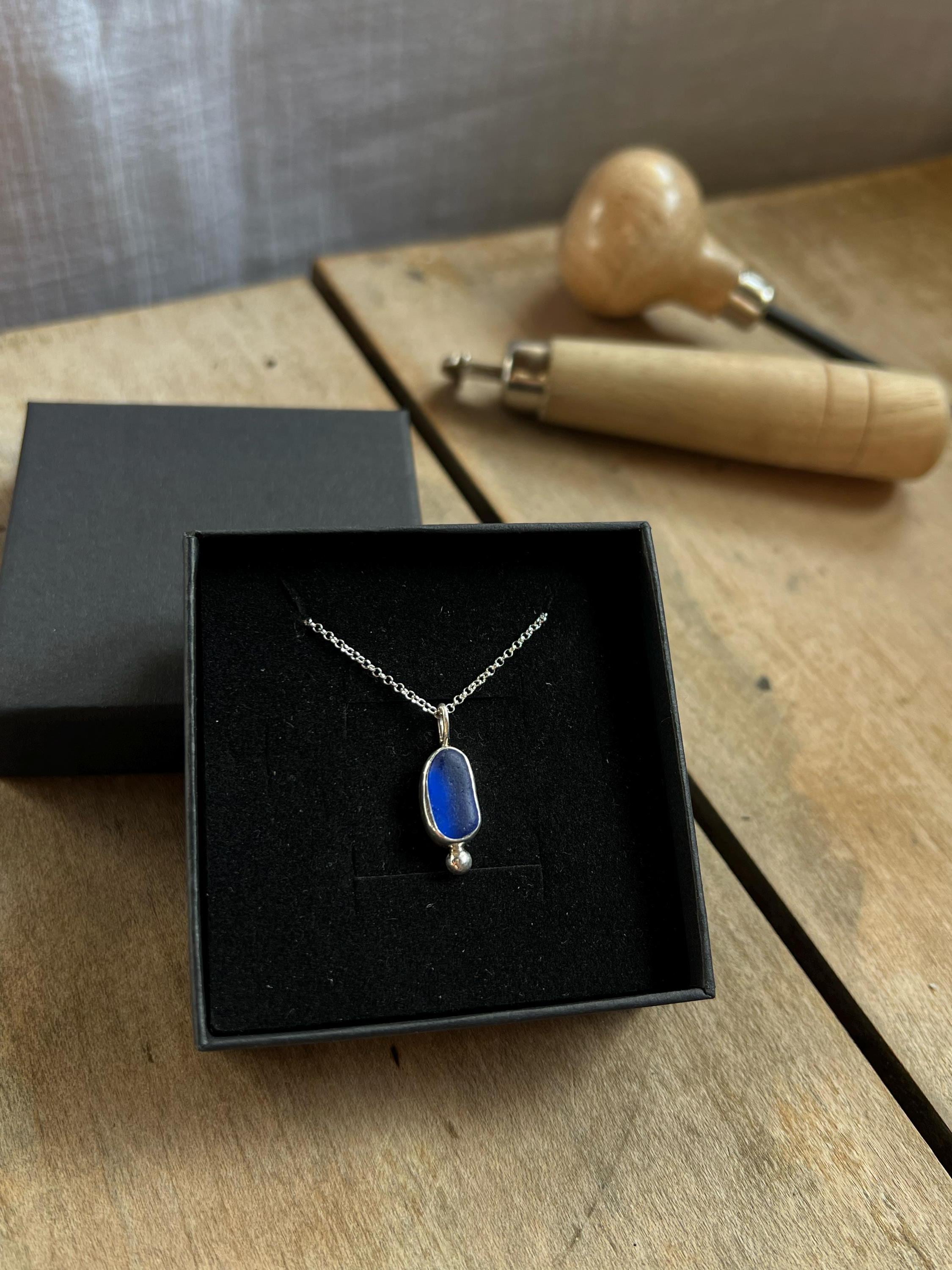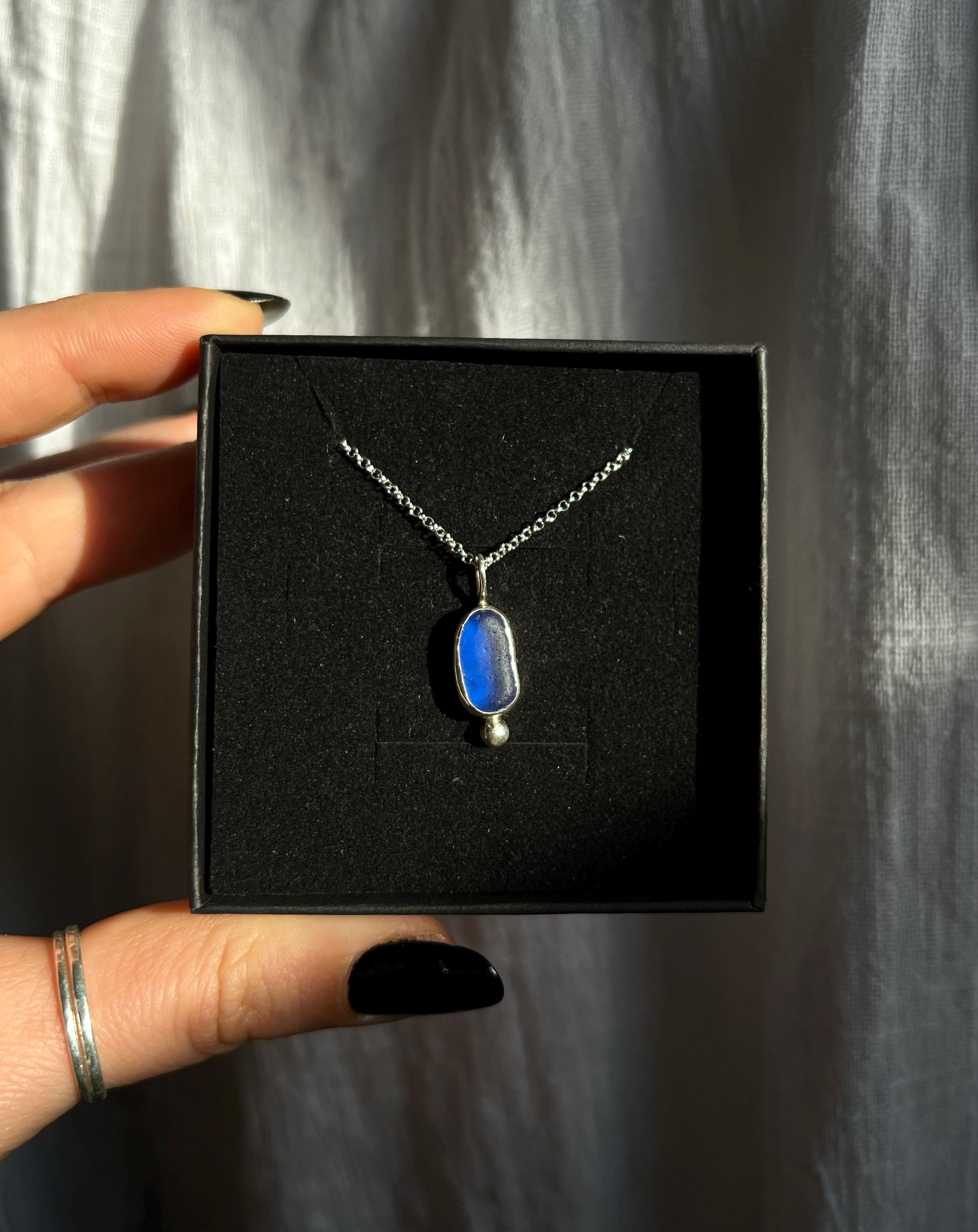 An authentic fragment of the sea turned into a jewel: handcrafted pendant in 925 sterling silver with cobalt blue sea glass, naturally smoothed by time and waves. An elegant and timeless marine detail. The price refers to the pendant only; to receive the 925 sterling silver chain as well, please select the add-on option.