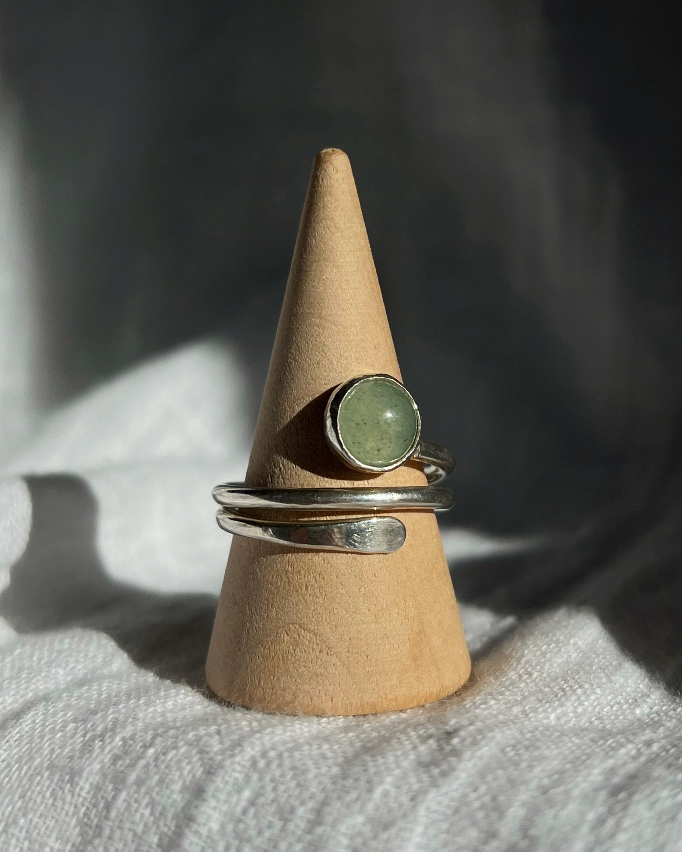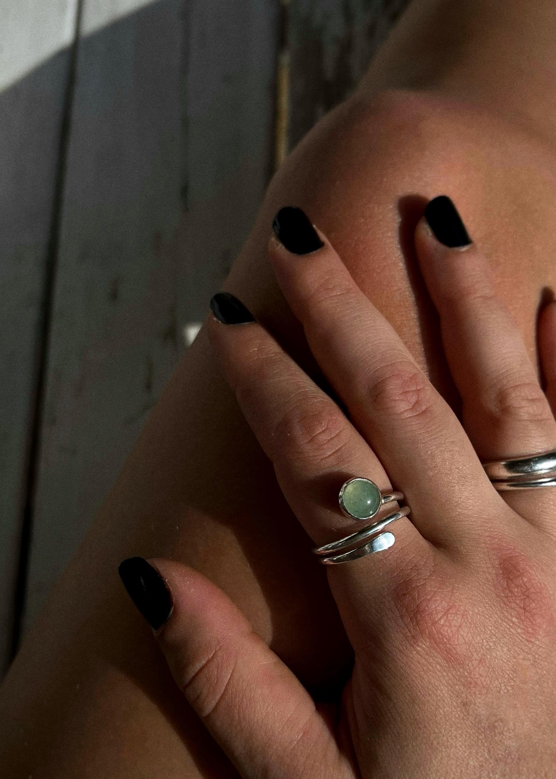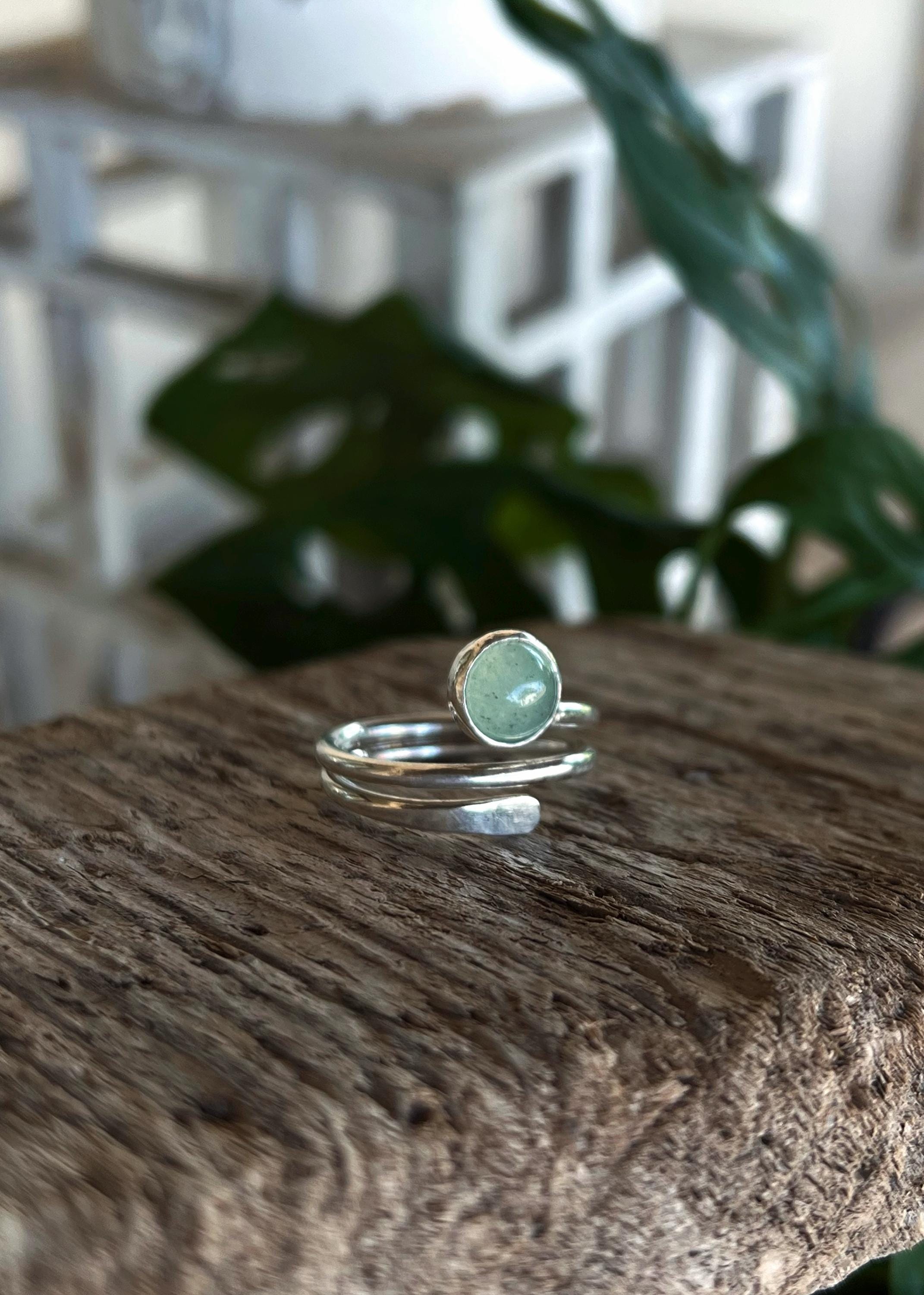 Carefully handcrafted, this 925 sterling silver ring features a round light green aventurine cabochon with a delicate, natural shine. Its unique shape wraps around the finger, creating an elegant and contemporary effect that highlights the stone while providing exceptional comfort.