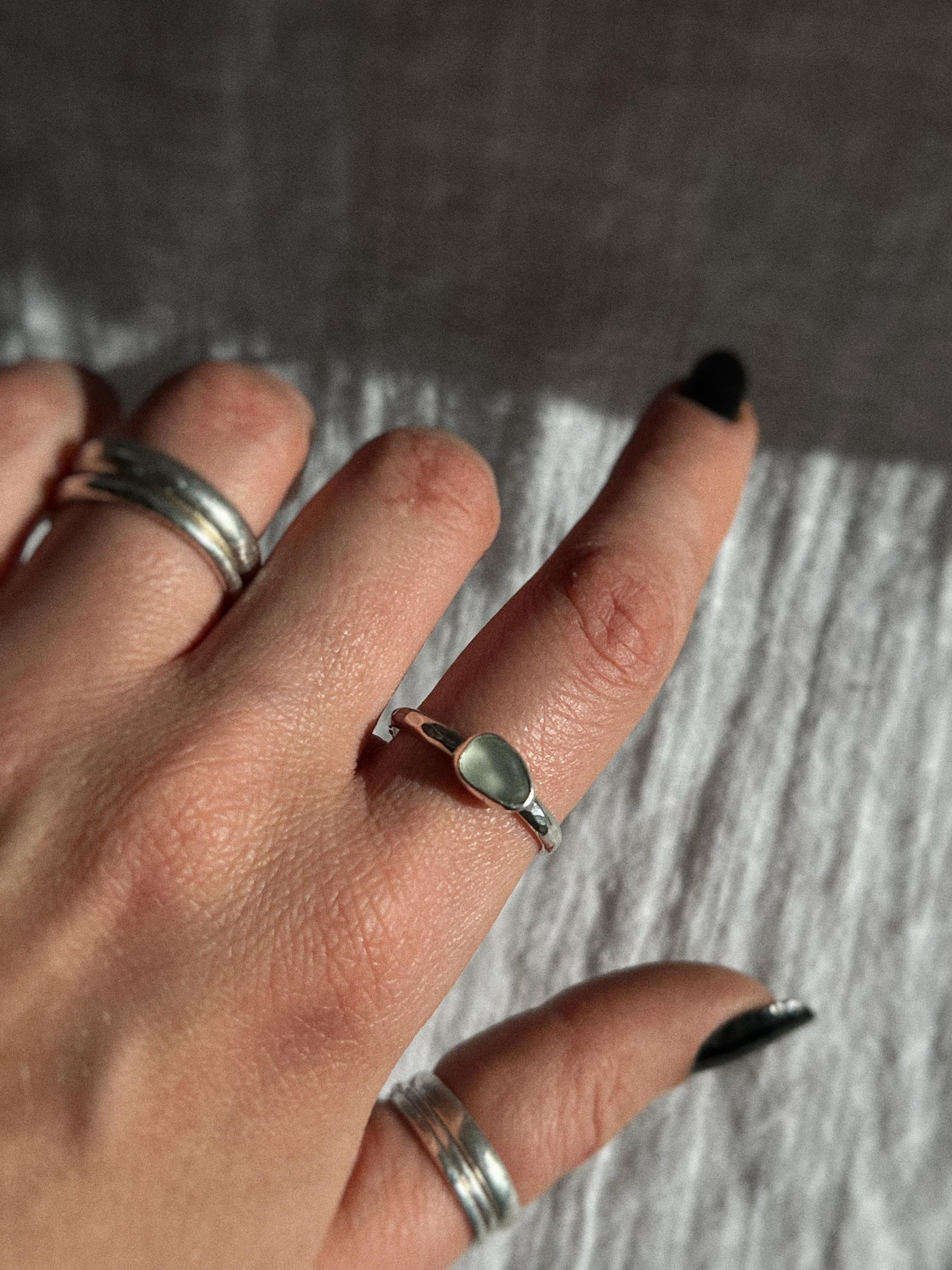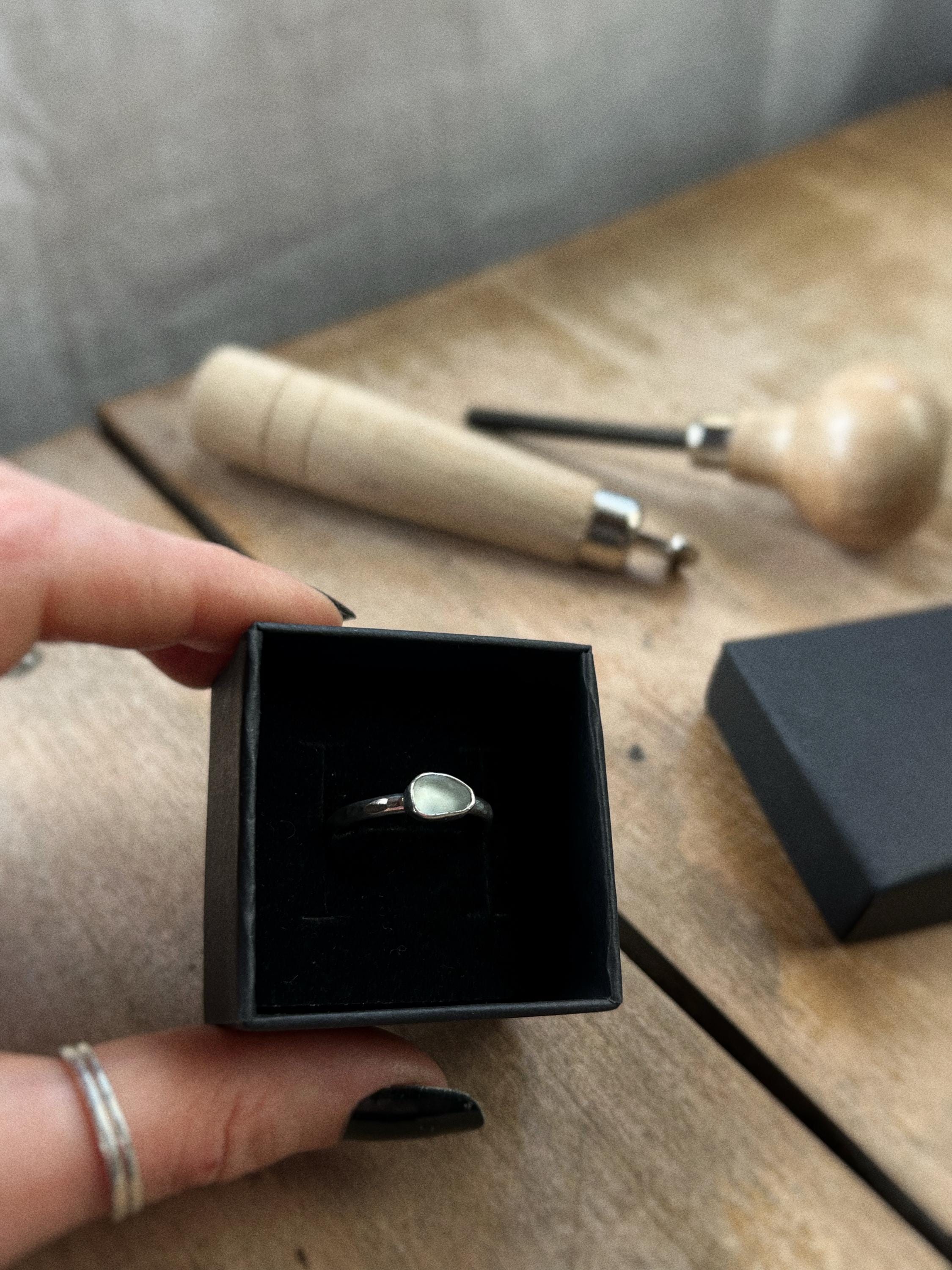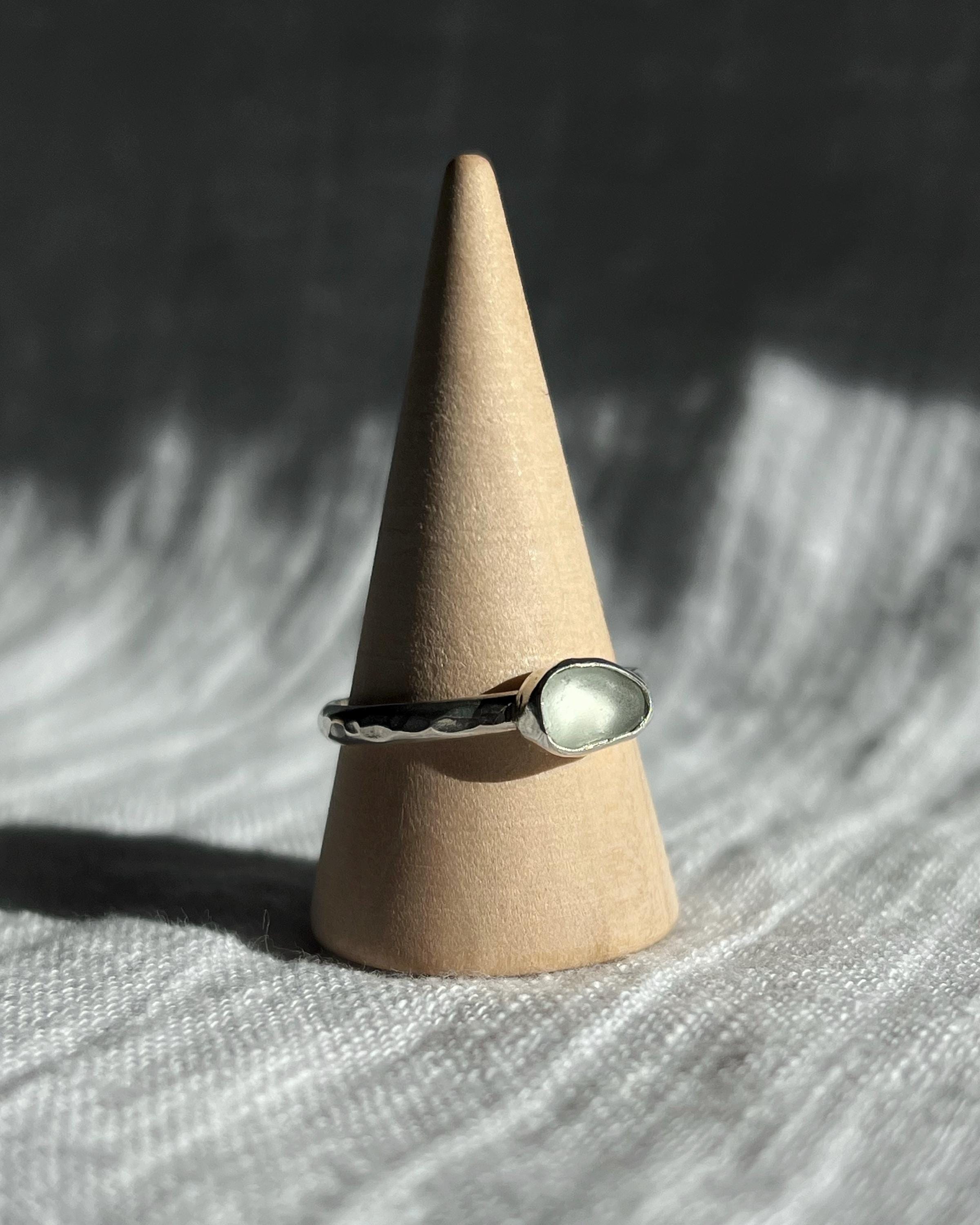 The combination of the hammered band and natural sea glass creates a piece that feels organic, timeless, and deeply connected to nature. Perfect for everyday wear or as a meaningful gift for someone who loves the ocean or finds symbolism in its cycles.