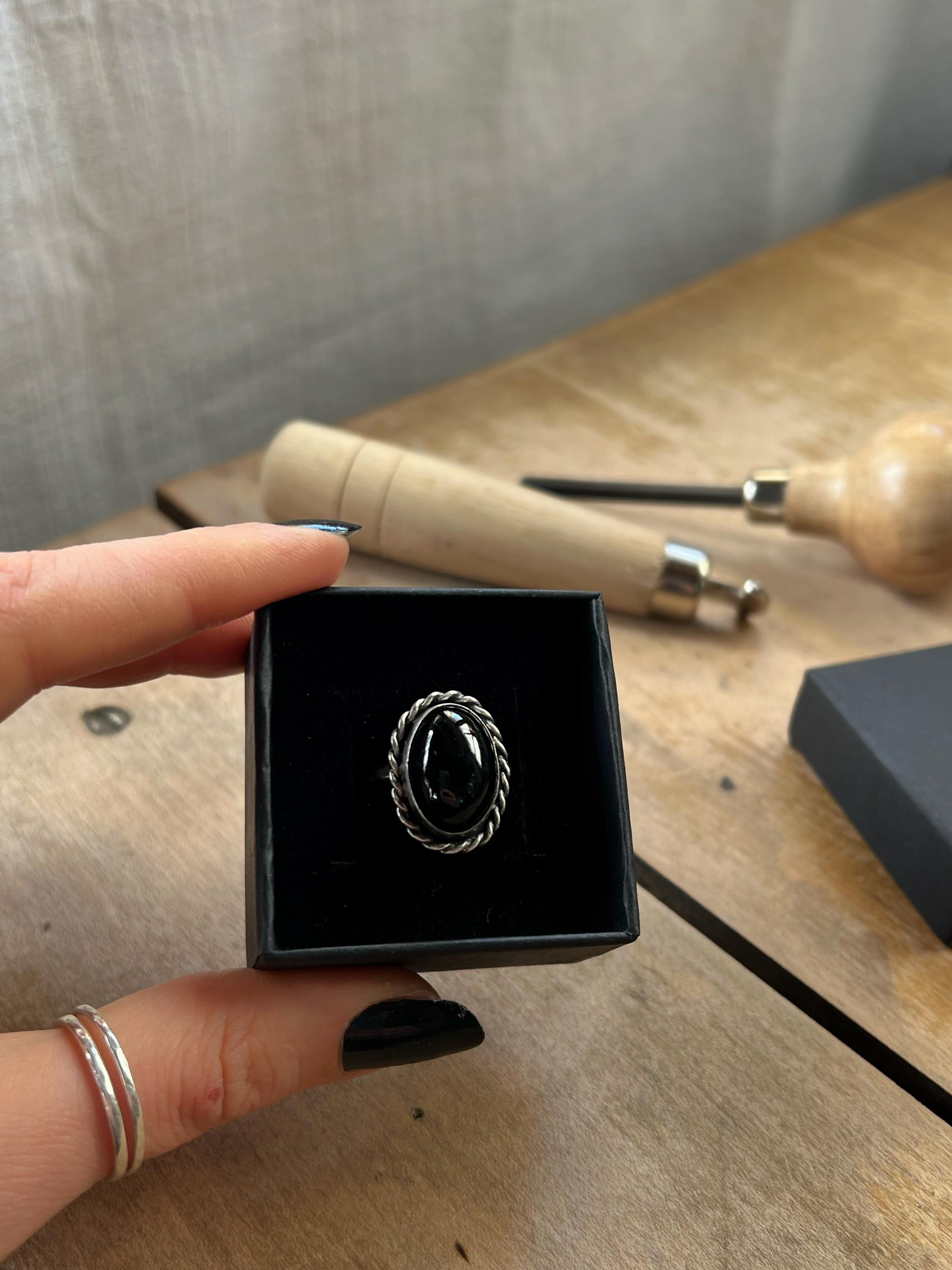 With its substantial design and the intensity of black tourmaline, this ring is a true statement piece—strong, raw, and uniquely expressive. Ideal for lovers of bold jewelry or those wanting to wear a symbol of protection and inner power.