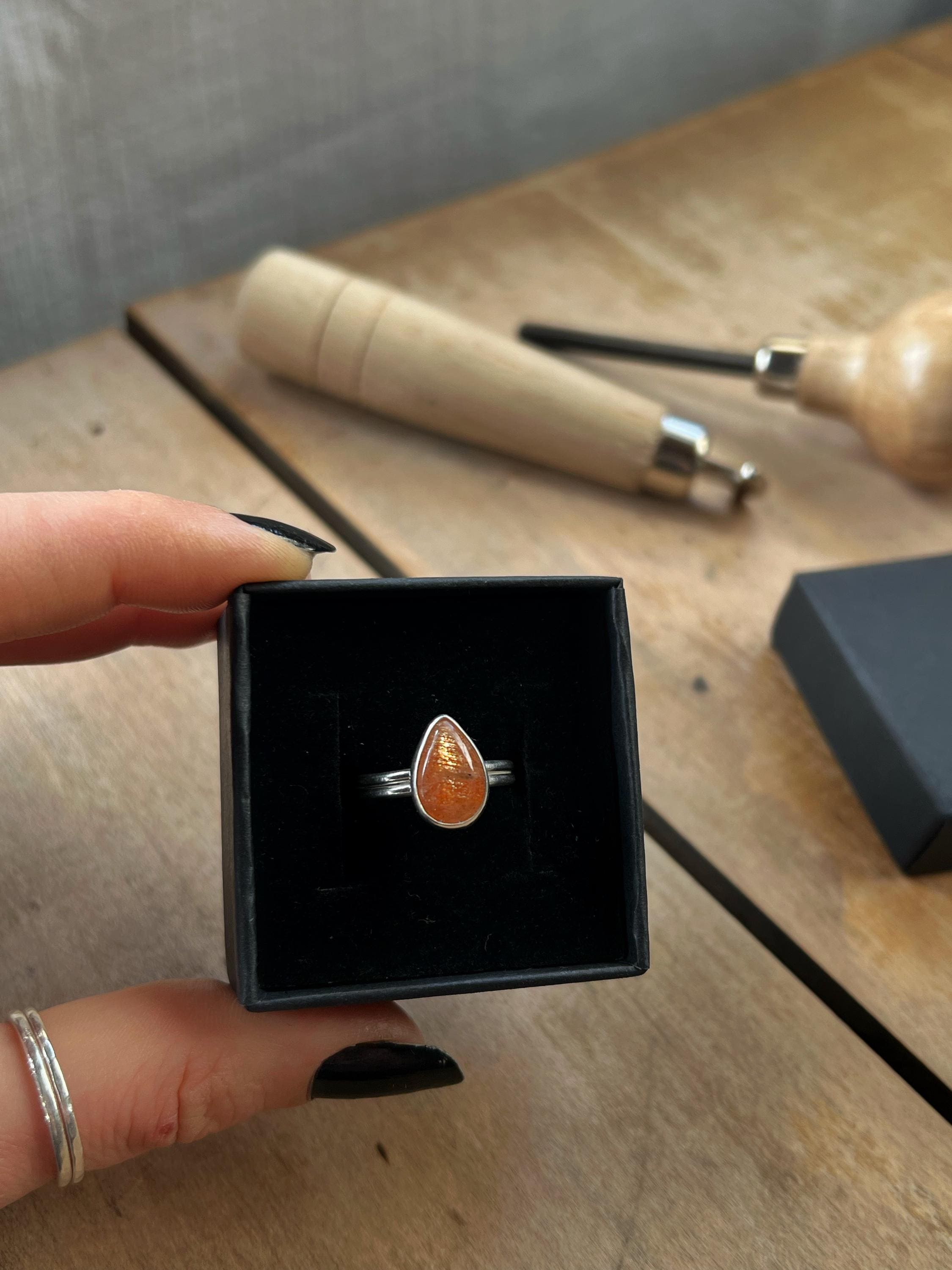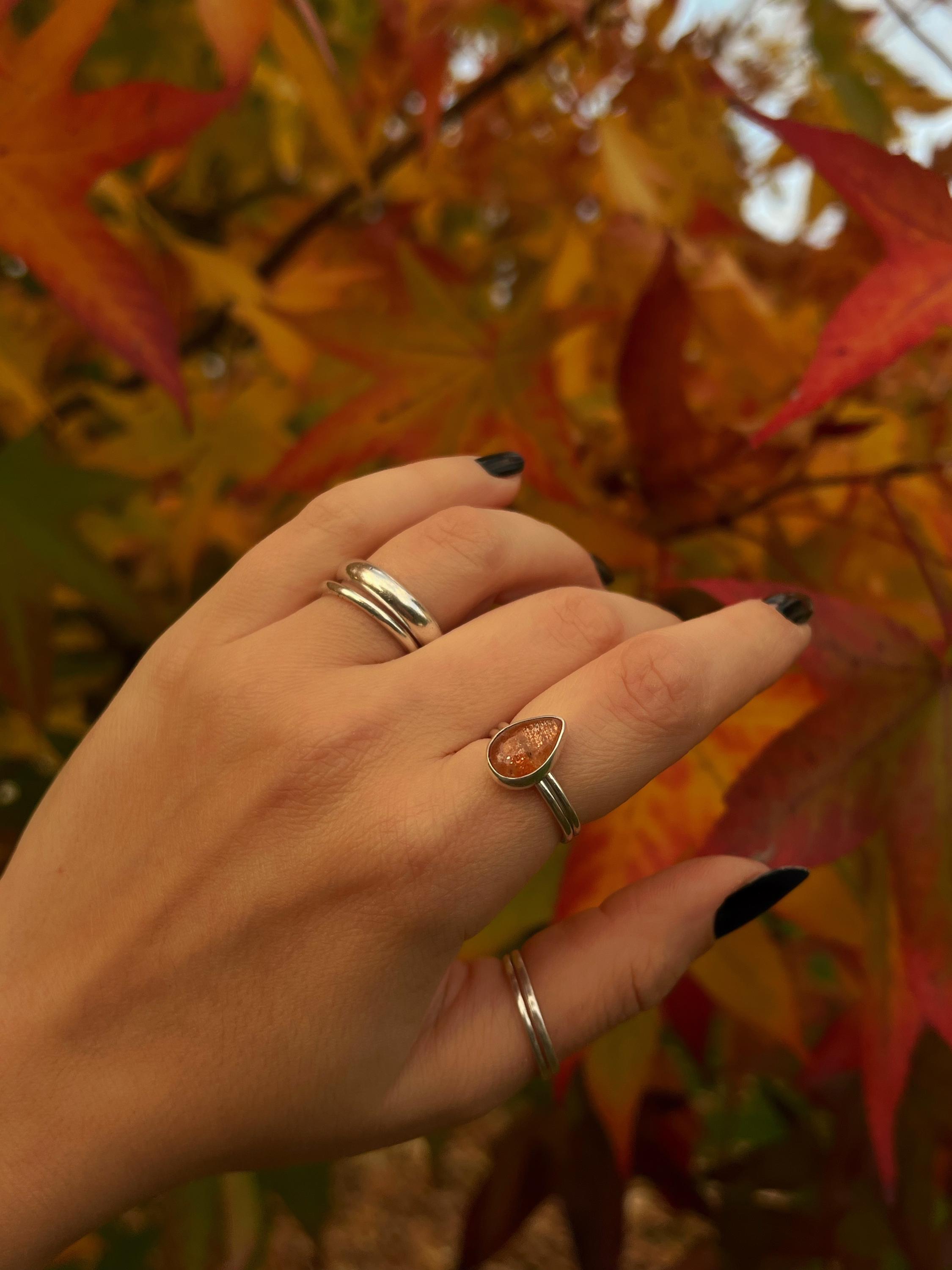 Handcrafted in 925 sterling silver, this ring features a stunning natural sunstone in a teardrop shape, chosen for its remarkable luminosity.