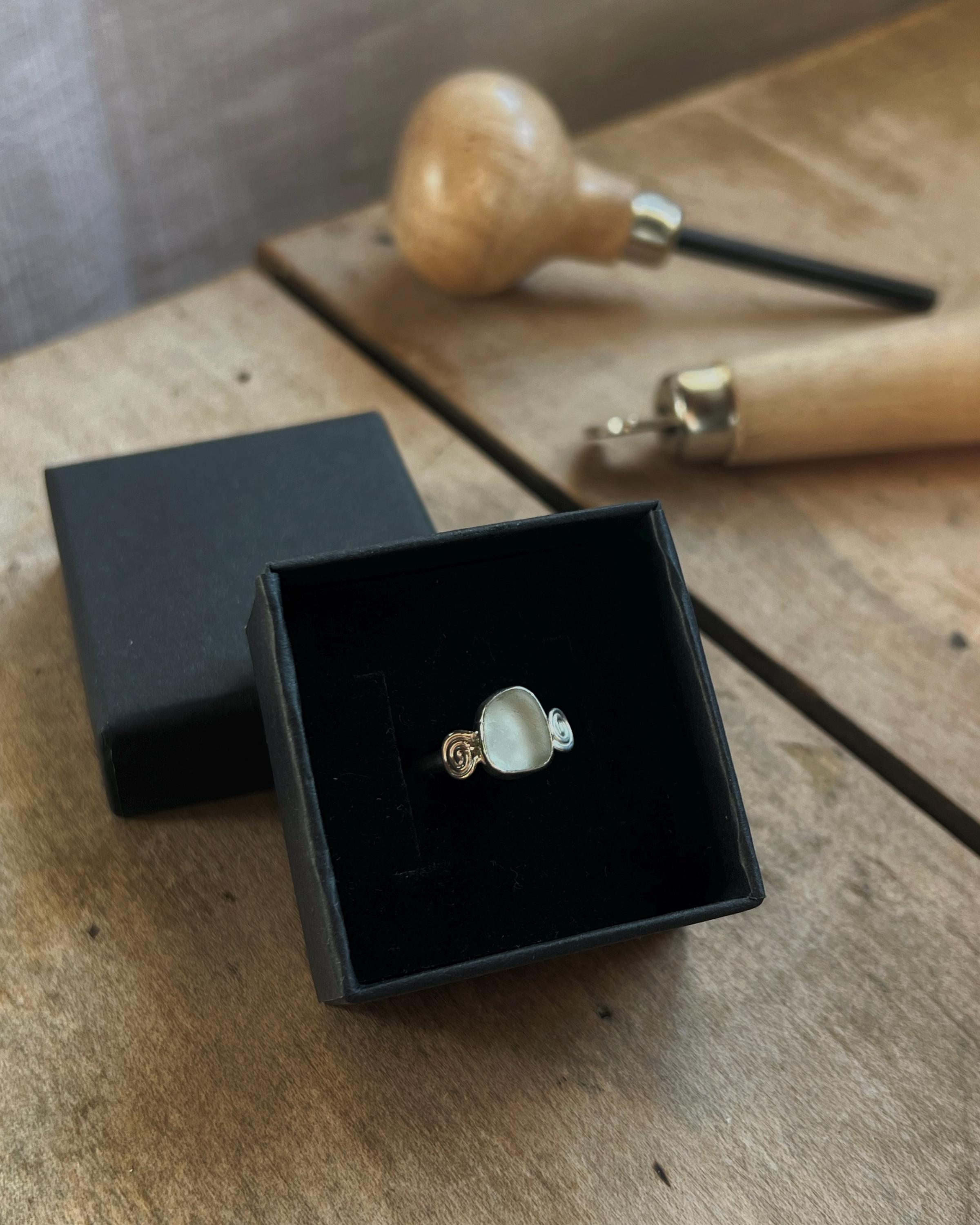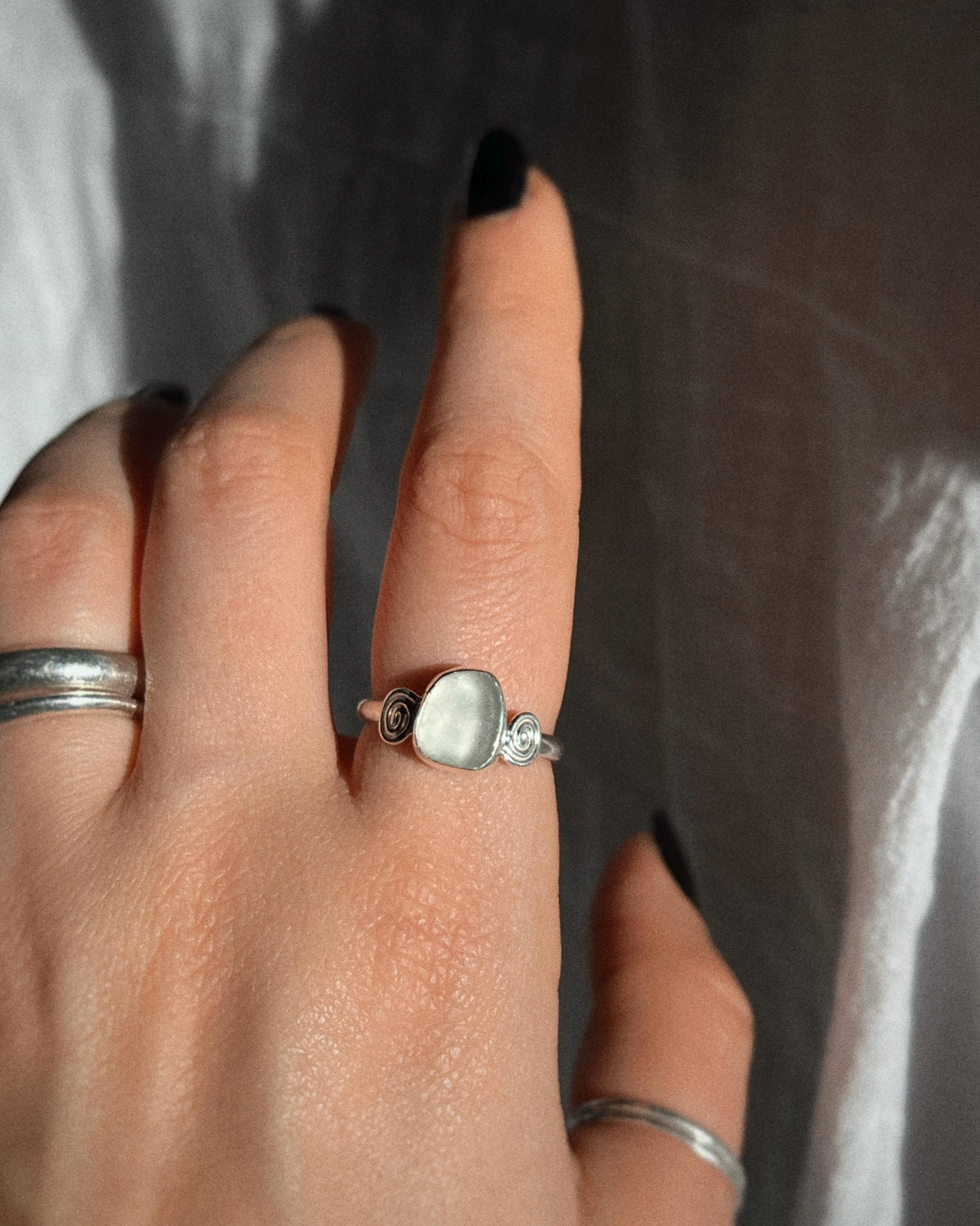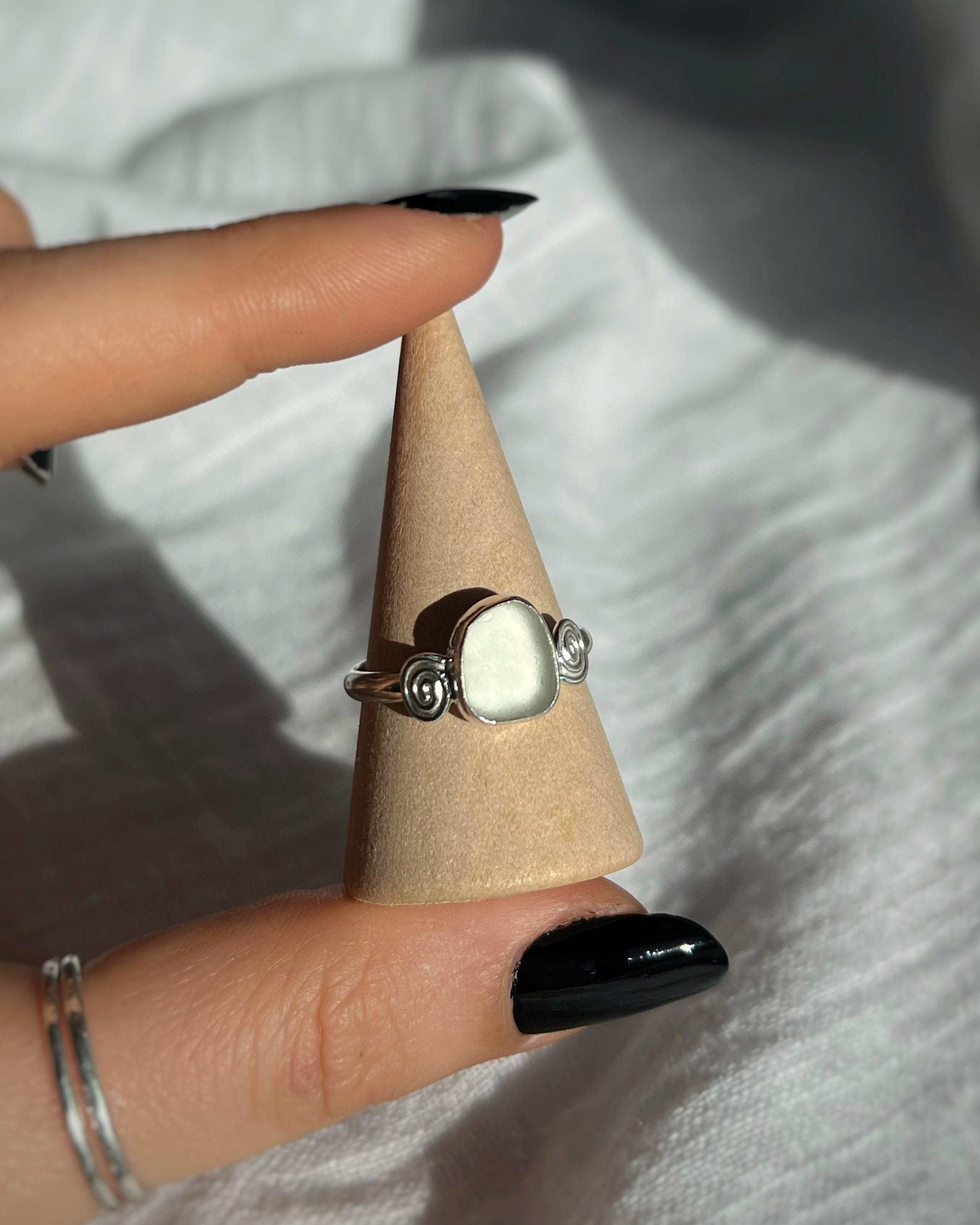 The delicate white sea glass, combined with silver spiral details, makes this ring perfect for those who love jewelry inspired by nature and the sea.
