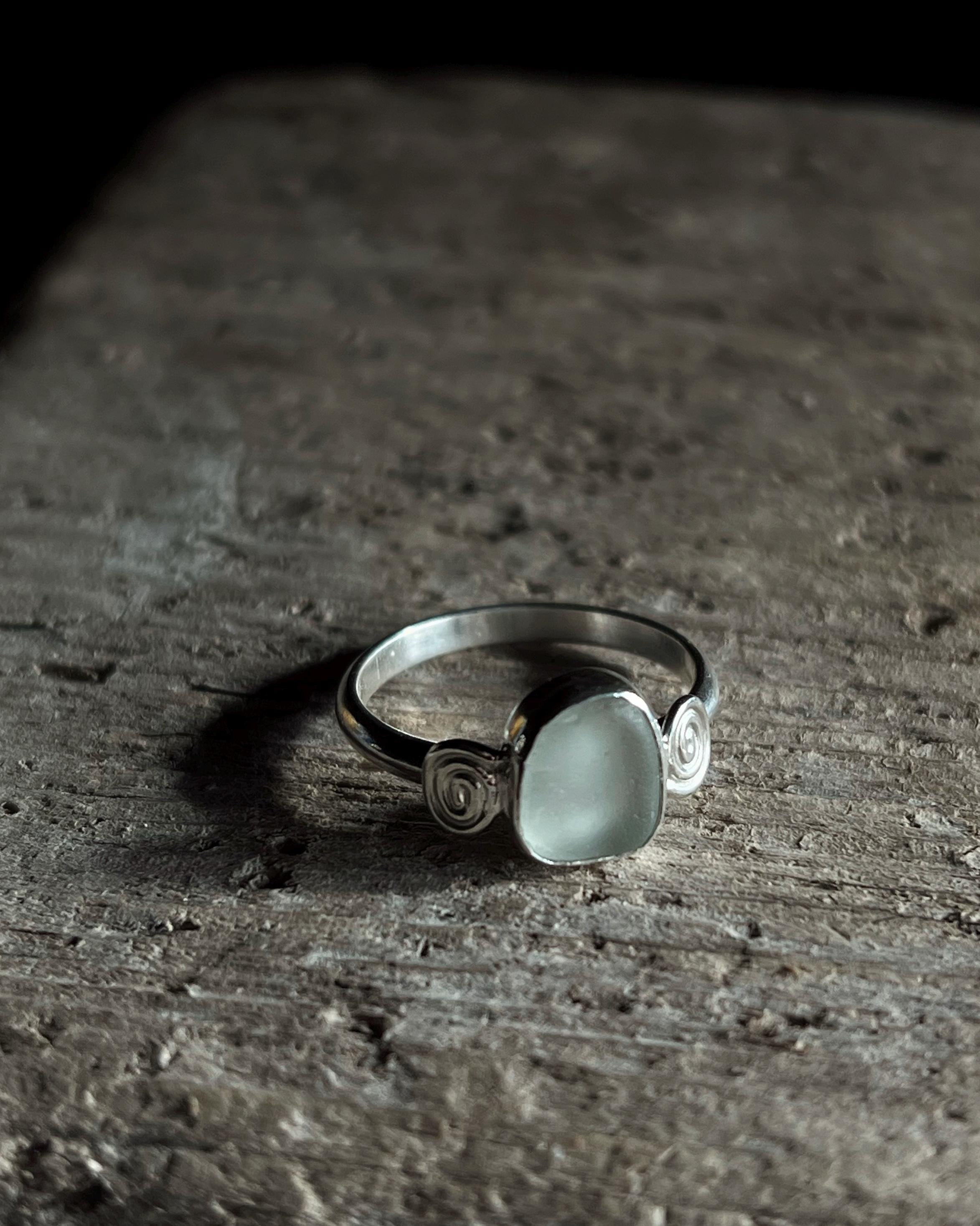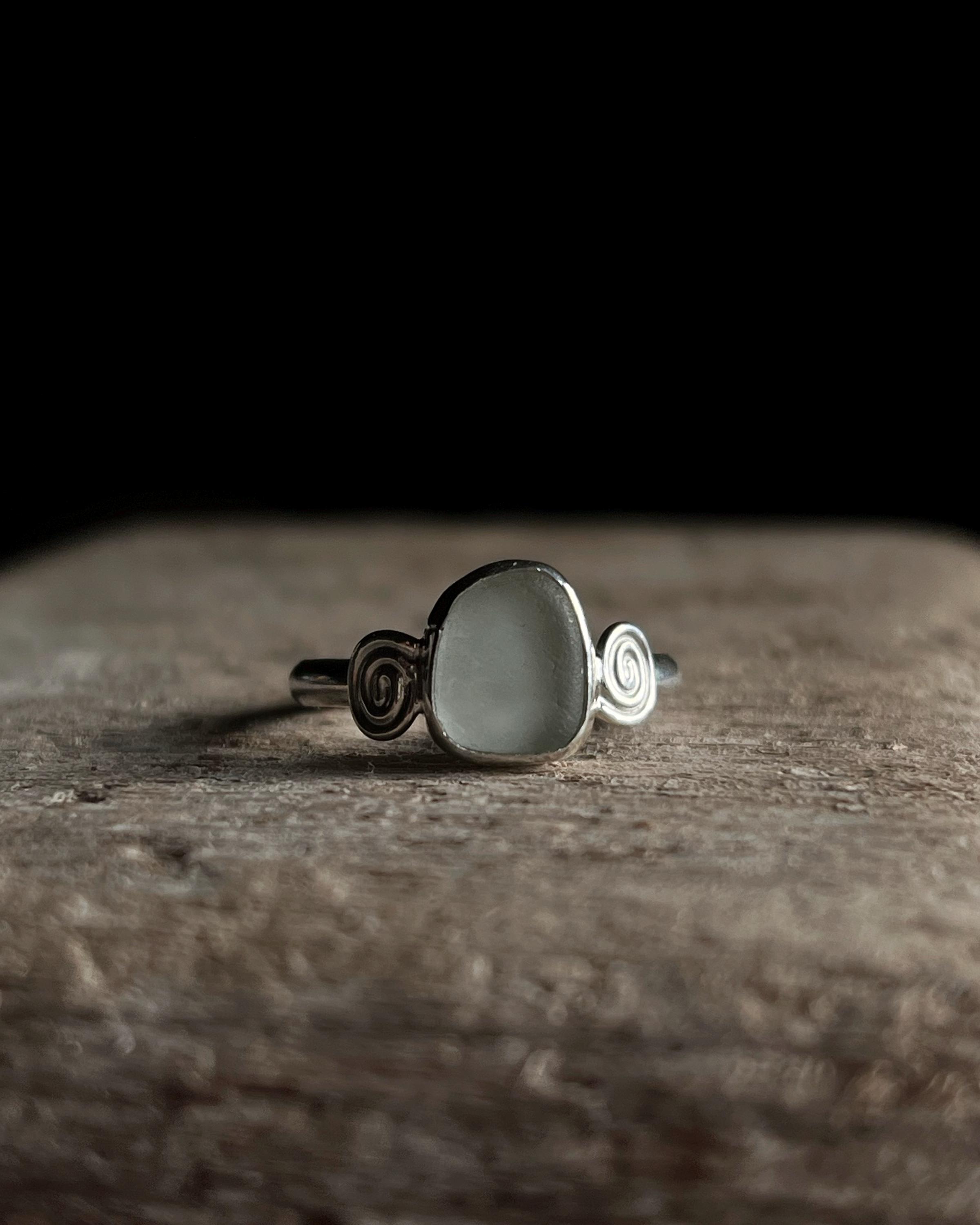 This handcrafted 925 sterling silver ring celebrates the authentic beauty of white sea glass, set in a clean, essential design enriched with two decorative silver spirals.