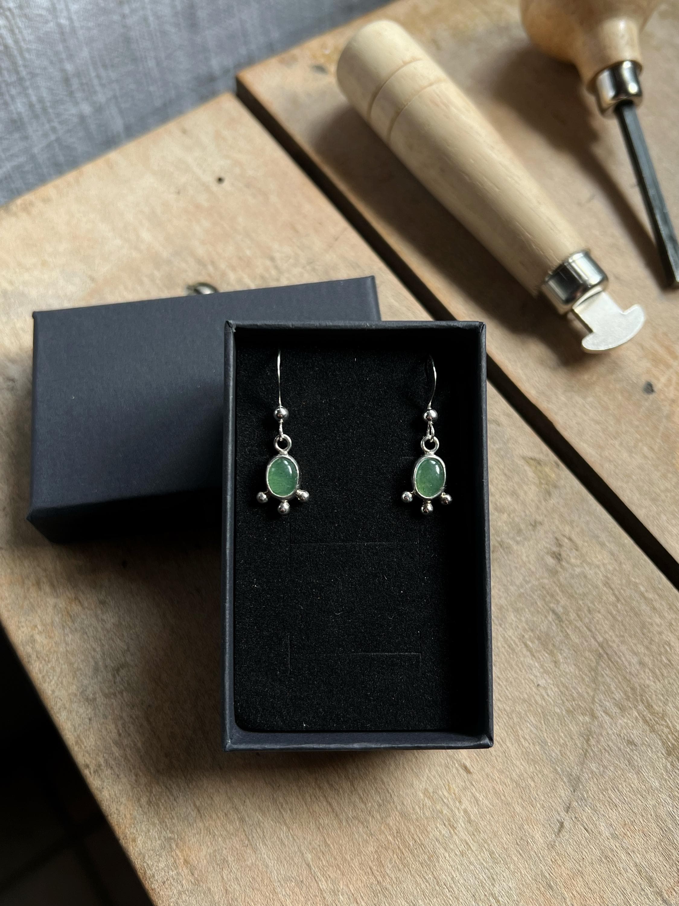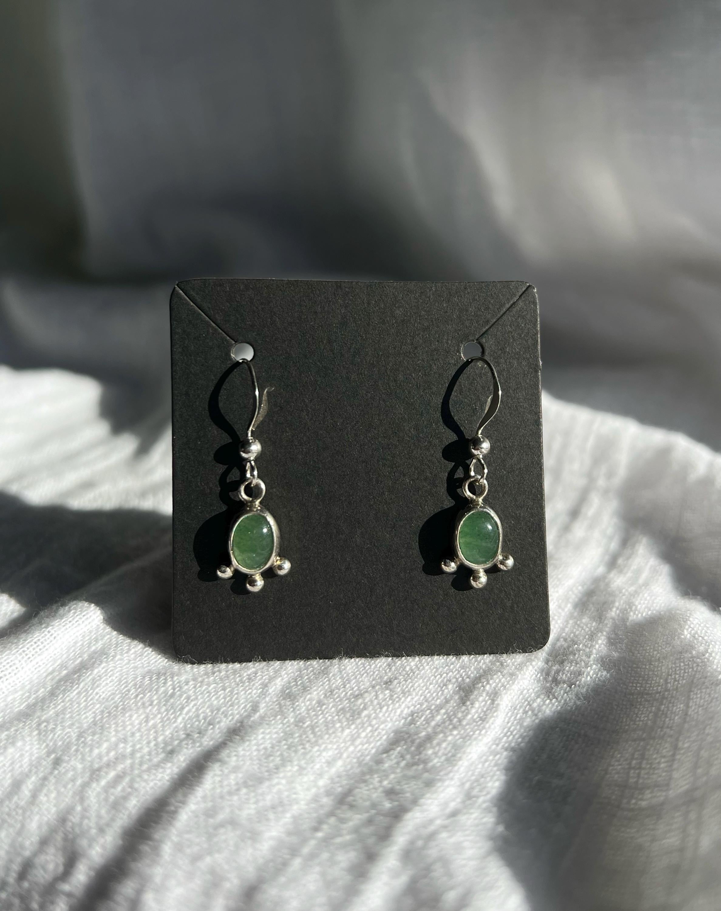These handcrafted 925 sterling silver earrings feature two natural green aventurine stones, selected for their fresh and luminous color. Each stone is unique, with subtle variations in shade and natural patterns.