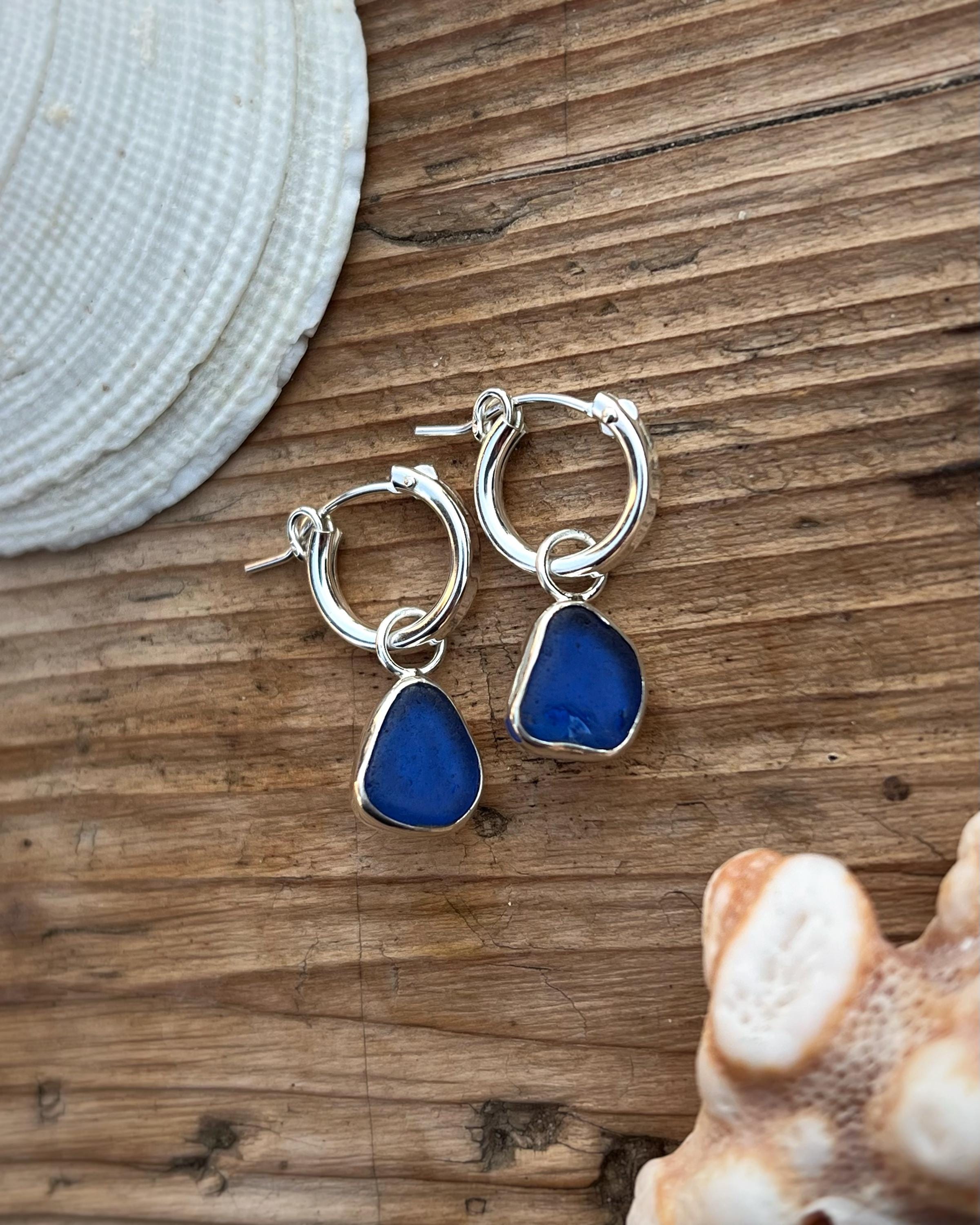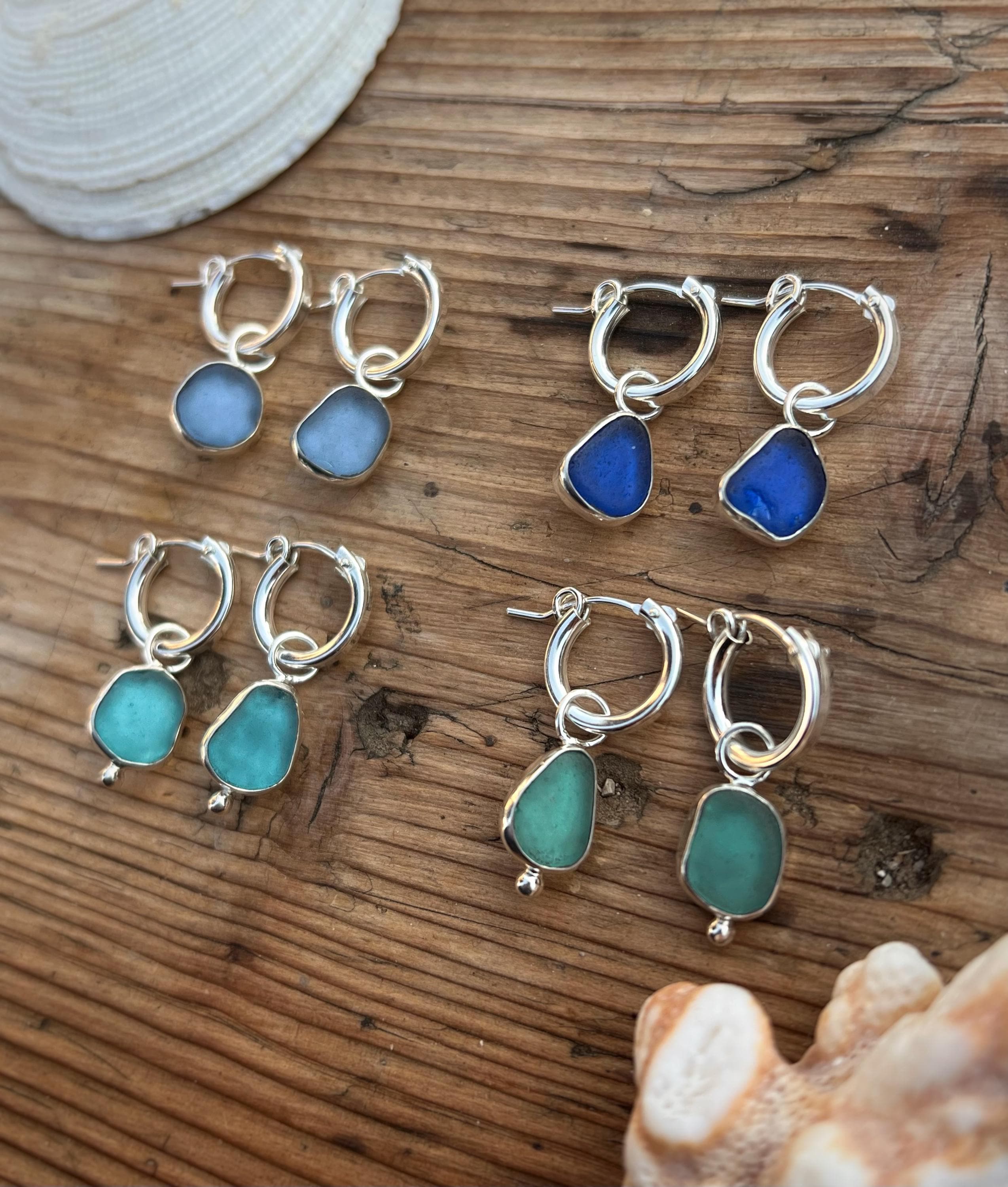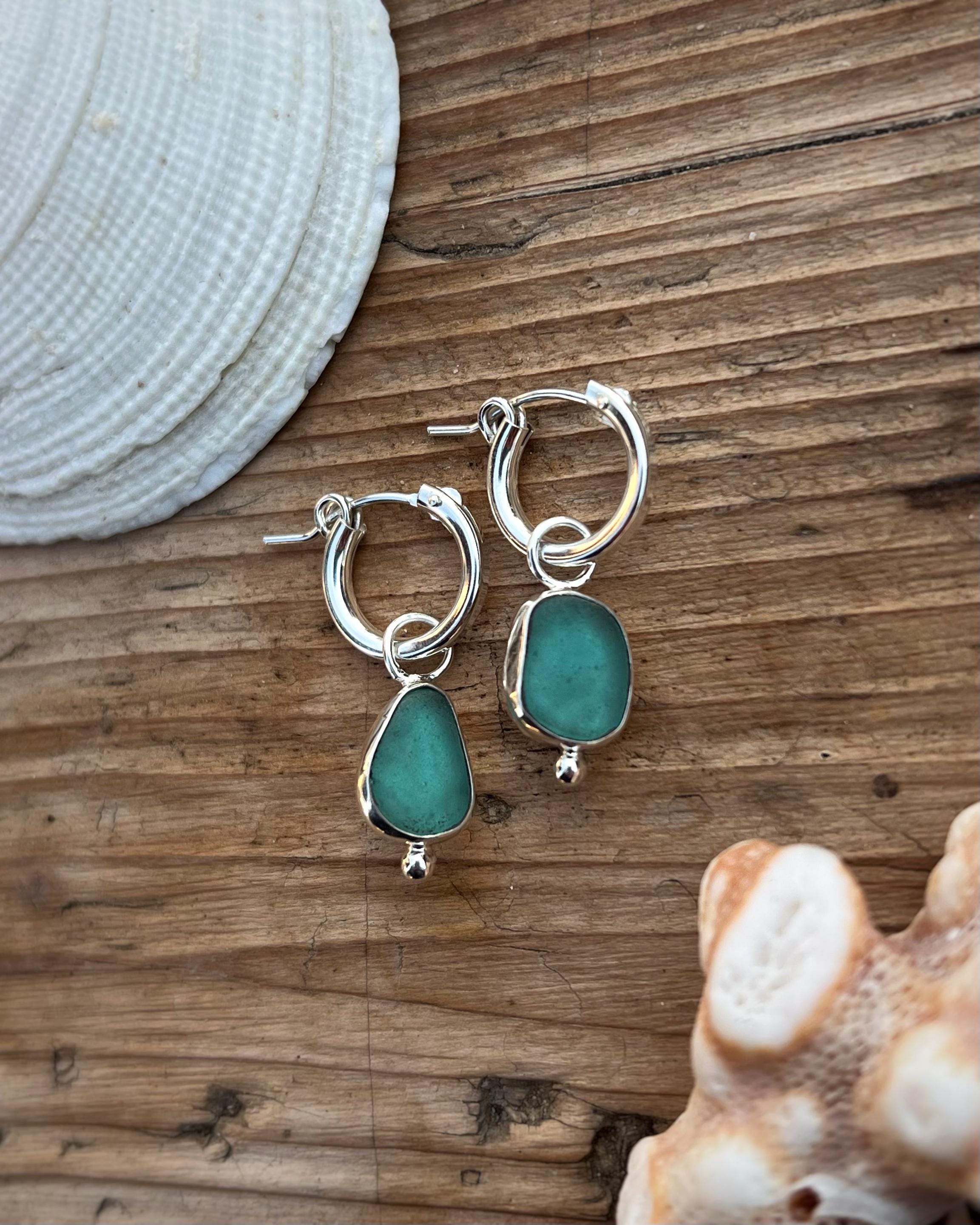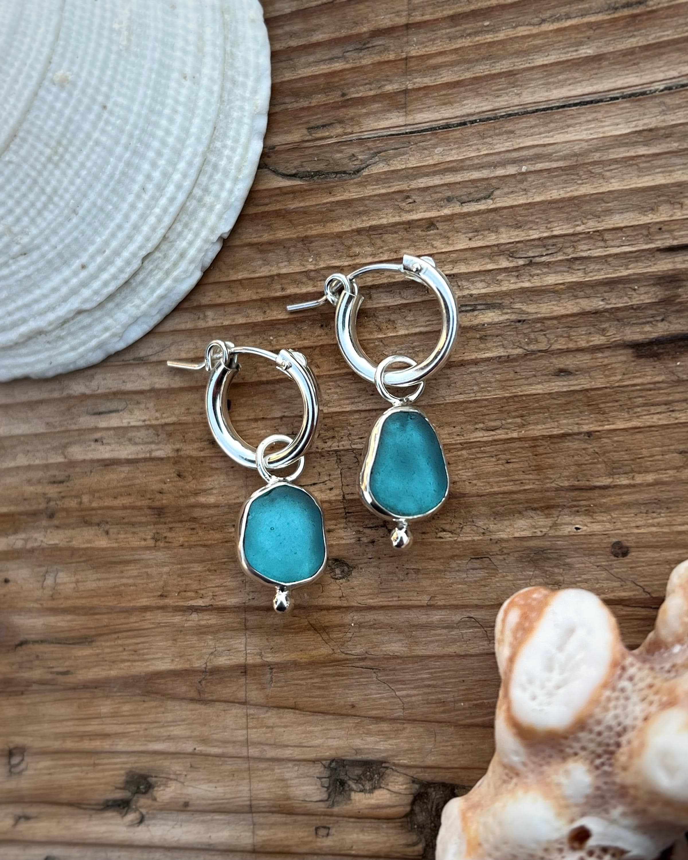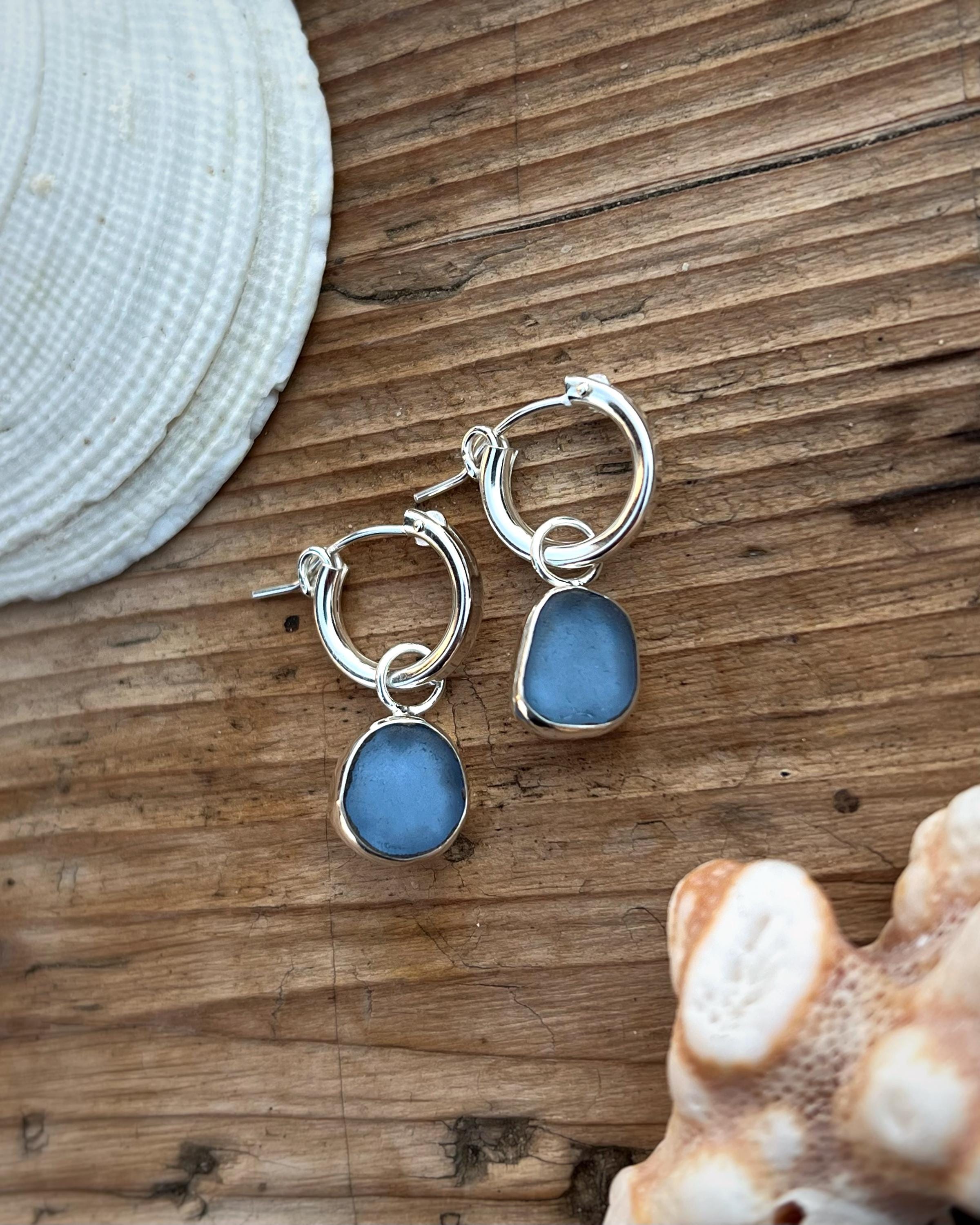 Hoop earrings with sea glass, crafted in 925 sterling silver. The hoops measure 13 mm in diameter and are designed to be lightweight, minimal, and easy to wear every day. The sea glass, naturally smoothed by the ocean, gives each pair a unique and delicate character.